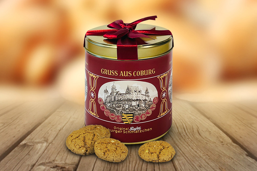 Hübsche Dose mit Schleife und Banderole, gefüllt mit 250g Schmätzchen.